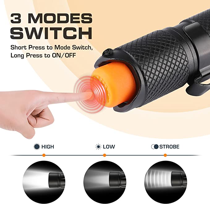 3 Lighting Modes: The flashlight features 3 lighting modes: high, medium and strobe, allowing you to choose your level of brightness for any given situation.