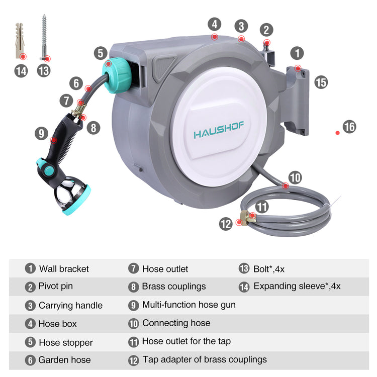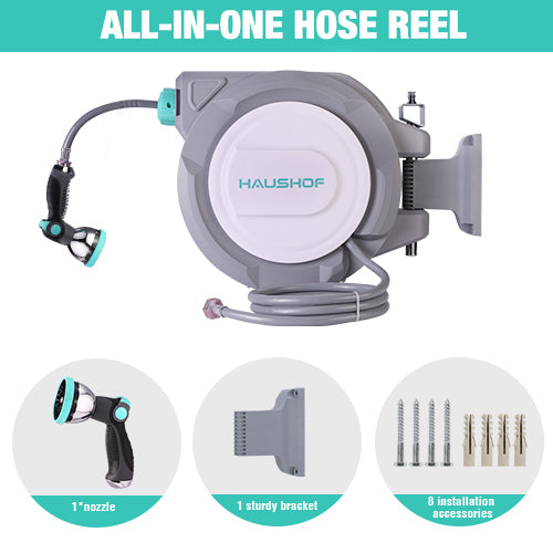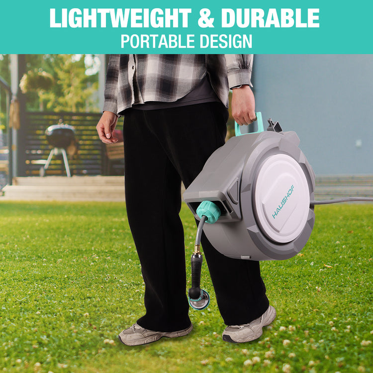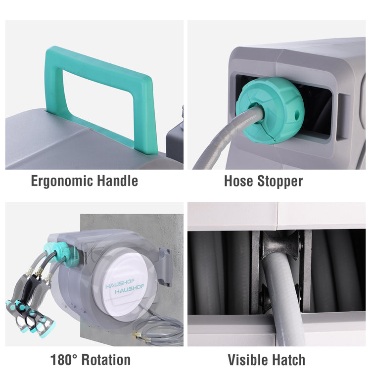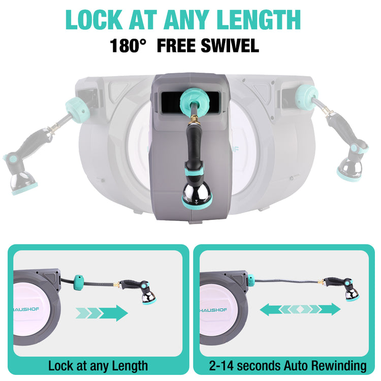HAUSHOF 1/2" x 100 ft Retractable Garden Hose Reel with Automatic Rewind, 10-Pattern Spray Nozzle, Durable High-Pressure Hose, and 180° Swivel Bracket – Perfect for Watering Gardens, Cleaning Patios