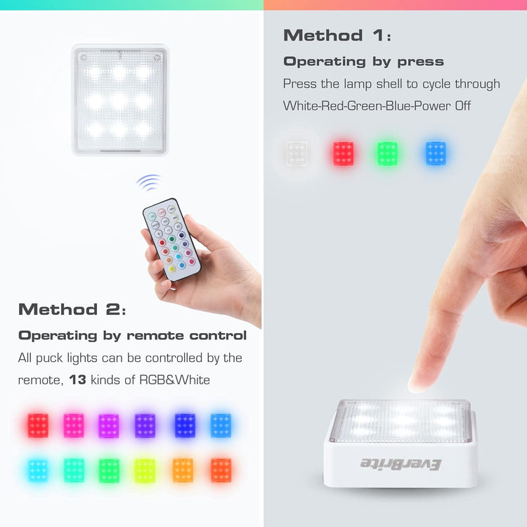 EverBrite Tap Lights, LED Closet Lights Night Lights with Remote Control, Battery Powered RGB Push Lights for Cabinet, Stairway, Party Indoor or Outdoor(6 Pack)