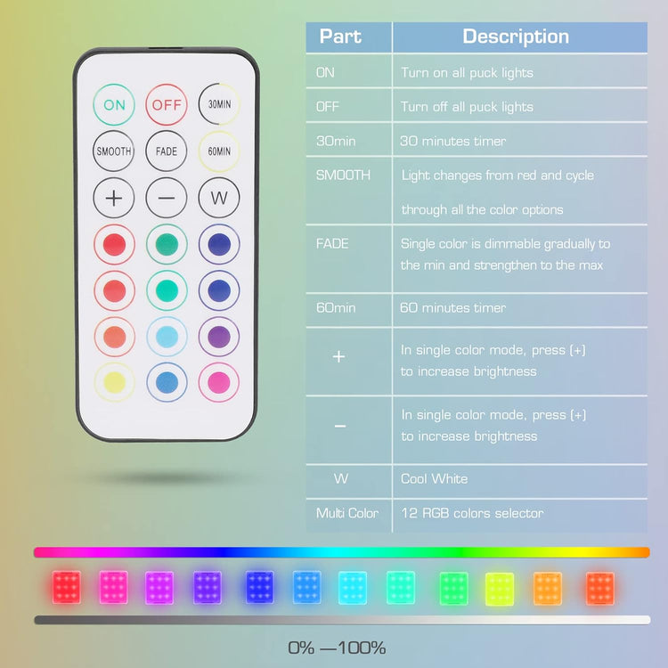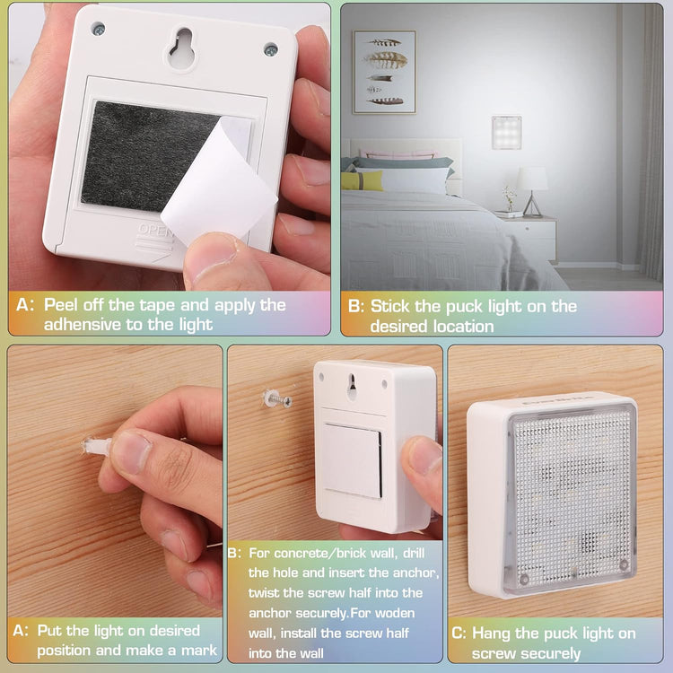 6 Puck lights, 2 remote controls, 18 AAA Alkaline Batteries, 6 screws, 6 anchors, 6 double-side tapes are included.