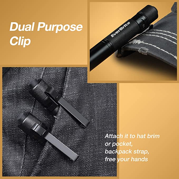 Lightweight and Portable: Each pen flashlight, weighing 3.9OZ, is small enough and super light, with dual-purpose clip, easily clip on hat, belt or backpack strap, easy to carry, free your hands when working or repairing.