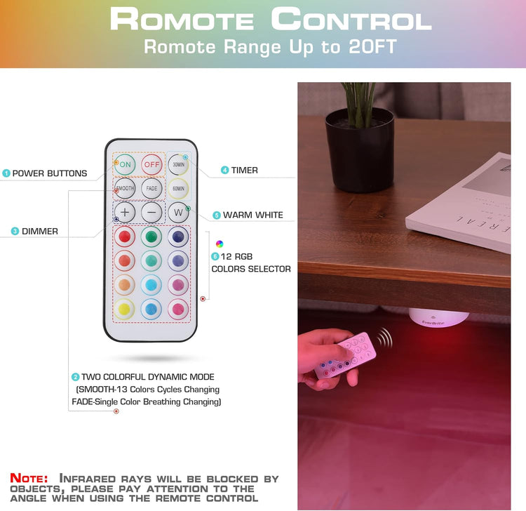 The set includes 6 LED puck lights (including batteries), 2 remote controls (with batteries), 6 Powerful double-sided tape and 1 user manual.